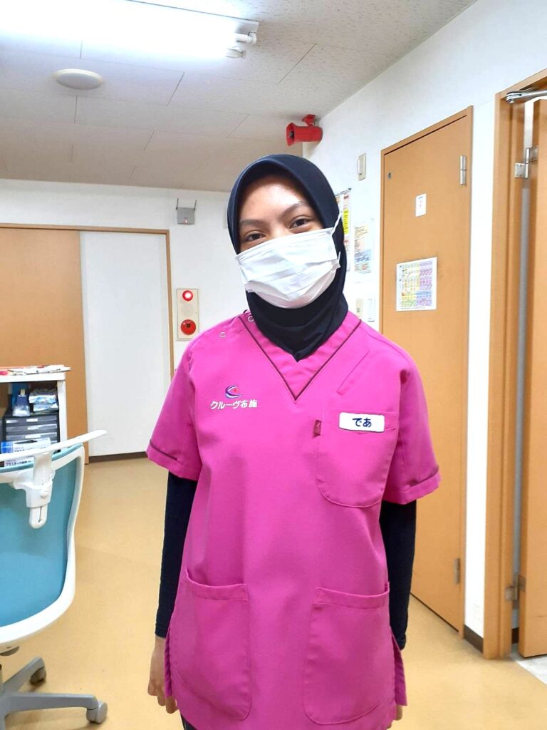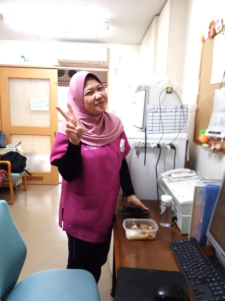 技能実習生(5.5期生)デアさんがオムツ交換後にお待たせしましたと駆け寄ってきてくれました。先日の忘年会のビンゴゲームで見事5等賞で5,000円当たって嬉しかったと話していました。