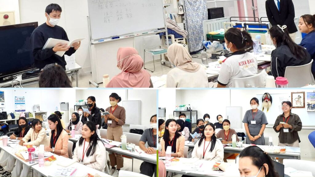 実際に現場に立った時に必要になる細かい部分まで、ちゃんと通訳さんを交えながら教えているので、とても役立つと思います。授業の後にK病院様に配属される実習生たちは看護部長様、副看護部長様、事務局の職員様からのお話しがありましたが、実習生たちは皆さん笑顔でとても嬉しそうにお話を聞いていました。
