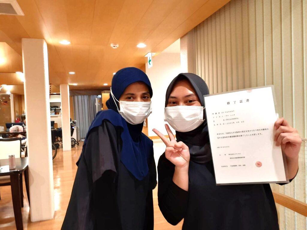 技能実習6期生のデラさん、ディアーさんに認知症介護e-ラーニング受講の終了証を手渡しました。誰よりも一番早く終わらせたことを褒めると照れながらも喜んでいました。一緒のフロアにいた5期生のジアも一緒に喜んでいました。