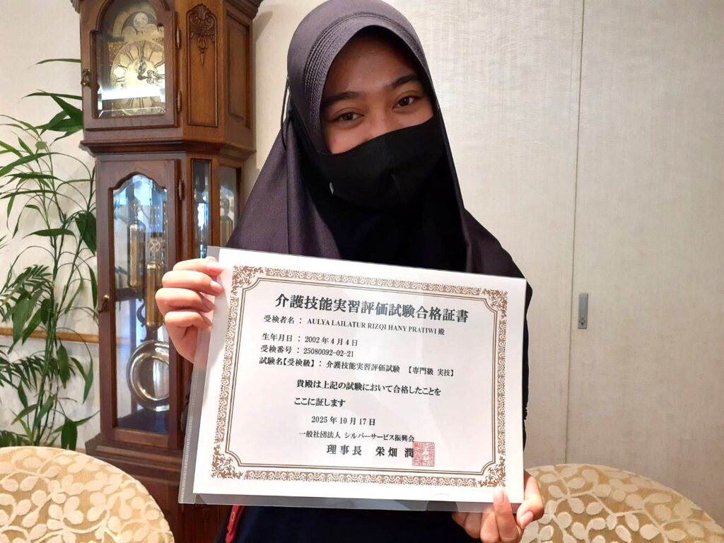 先月受けた介護技能実習評価試験【専門級】の合格証を手渡すと喜んでいました。前もって合格したことを伝えてありましたが、やはり実際の合格証を見ると嬉しさがこみ上げてくると思います。