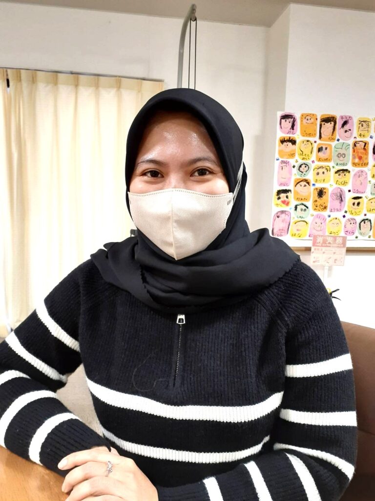 日本で働けて幸せです。日本が大好きです。仕事も楽しいです。時々はたいへんな時もありますが、みんなやさしいから、大丈夫です。日本語はインドネシアで勉強してきましたが、まだまだ勉強中です。二人でお休みに京都や大阪へ遊びに行くのが楽しみです。